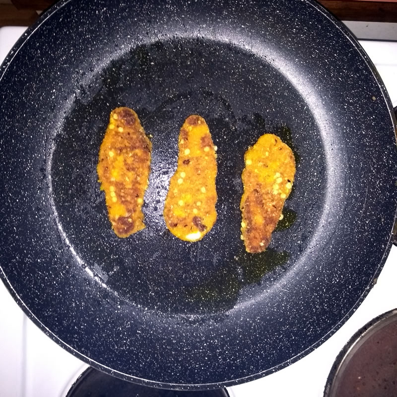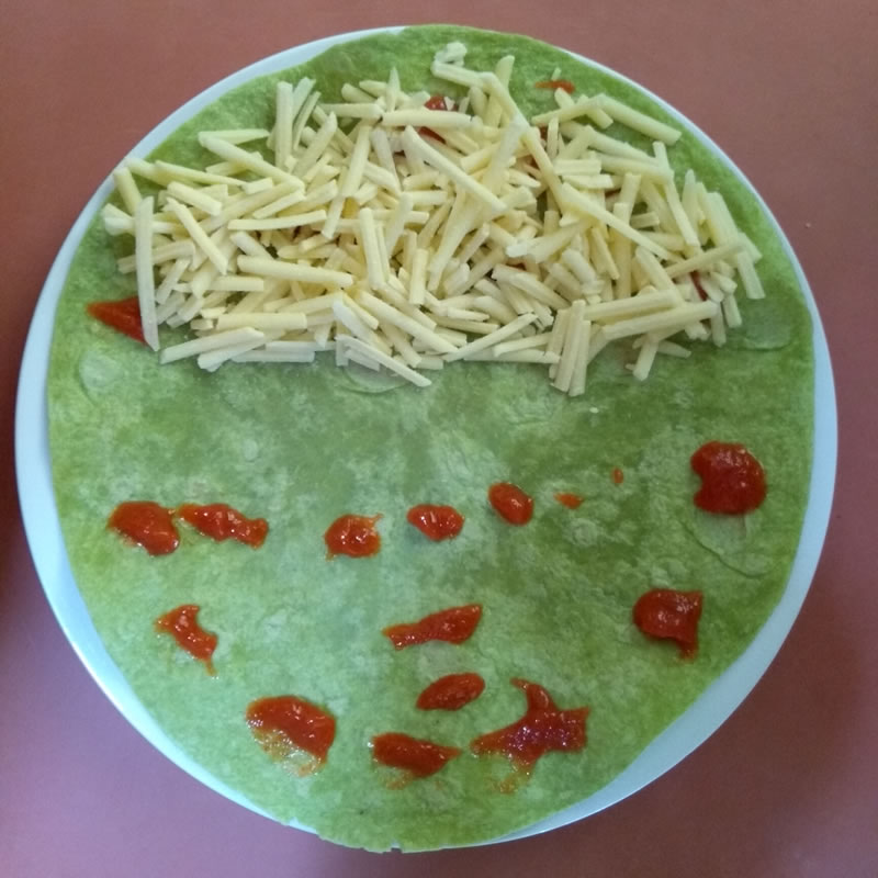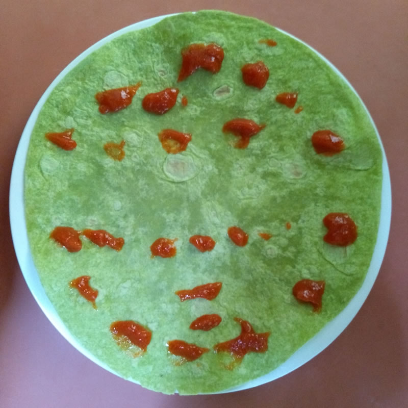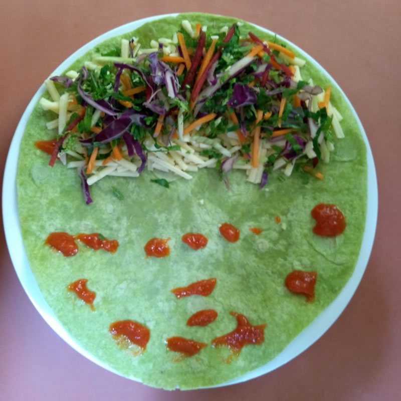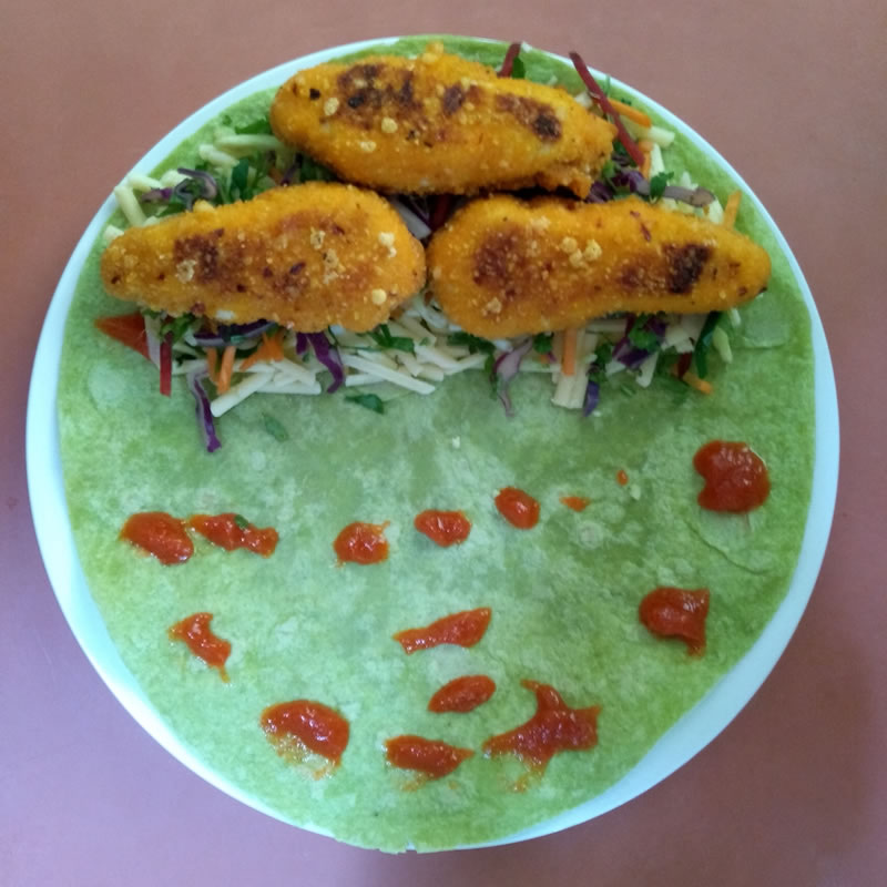 - While the chicken tenders are cooking prepare your wrap. Begin by applying the chilli sauce or any sauce you prefer its up to you.